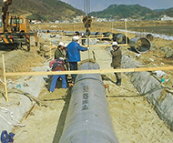 近年、農業基盤整備事業において水需要の増大にともない、パイプラインの長大化、大口径化、高圧化など利用技術の高度化がはかられています。これは、農業用水やそれを輸送する水路建設をめぐる社会環境が年々変化し、開渠に比較してのパイプラインの有利性が高くなってきた事や、管材料および施工技術の向上、進捗に負うことも大きいと考えられます。しかし最近では、『水路用地取得の困難性から路線が山地へ追いやられる。』『市街地では騒音問題・施工期間短縮の社会的要請や重機利用の制約がある。』『軟弱地盤や低平地にも布設せねばならず軽量性・可とう性や流速係数の有利な管が要求される。』『設計施工上その安全確保が要求される。』などの問題点が発生しており、農業用エスロンRCPは、これらの問題点に対応すべく生まれた管材で日本工業規格JIS A 5350に準拠しています。