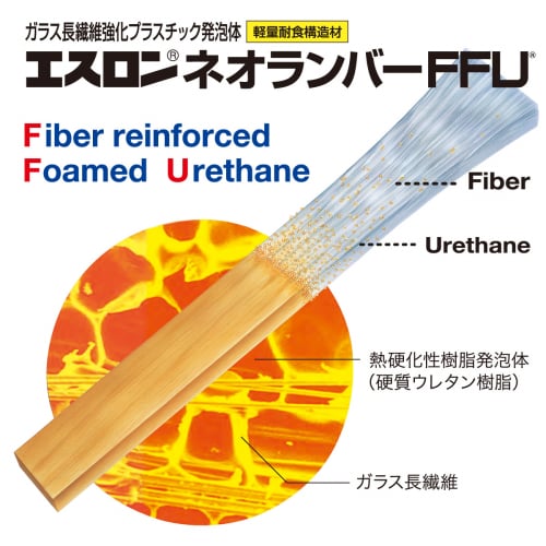 「エスロネオランバーFFU」は、硬質ウレタン樹脂発泡体をガラス長繊維で強化した軽量耐食構造材です。構造材として十分な強度を持ちながらも、重量は木材並みと軽く、加工性にも優れています。また、プラスチック素材なので耐久性、耐水性にも優れています。これらの特長を活かし、FFUは、上下水道分野、土木分野、建築分野、工場施設、水産養殖分野、鉄道分野などに幅広く採用されています。